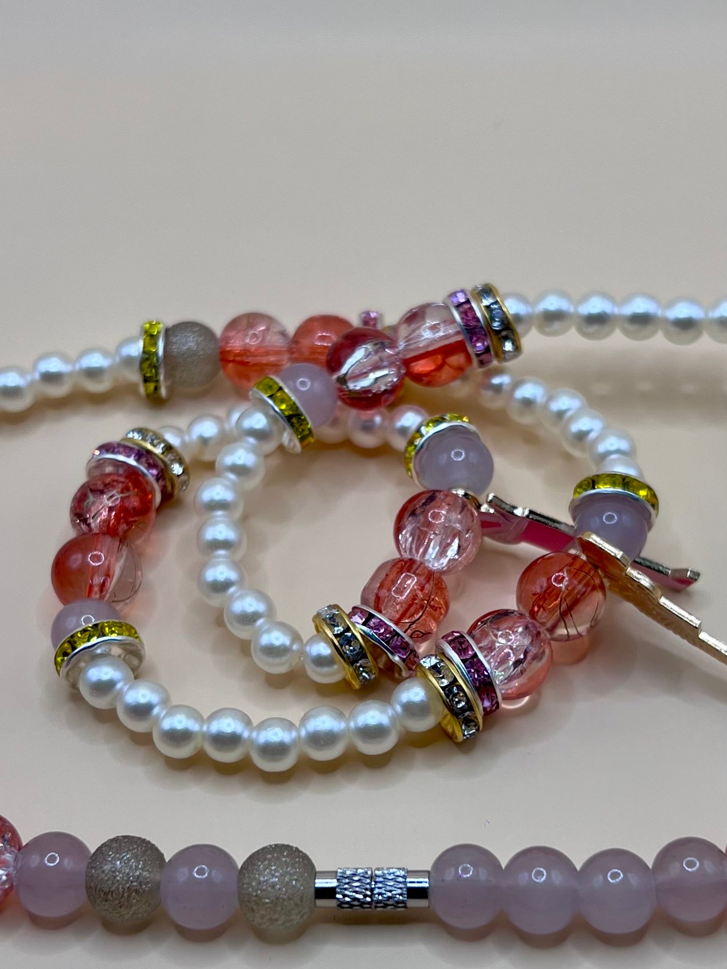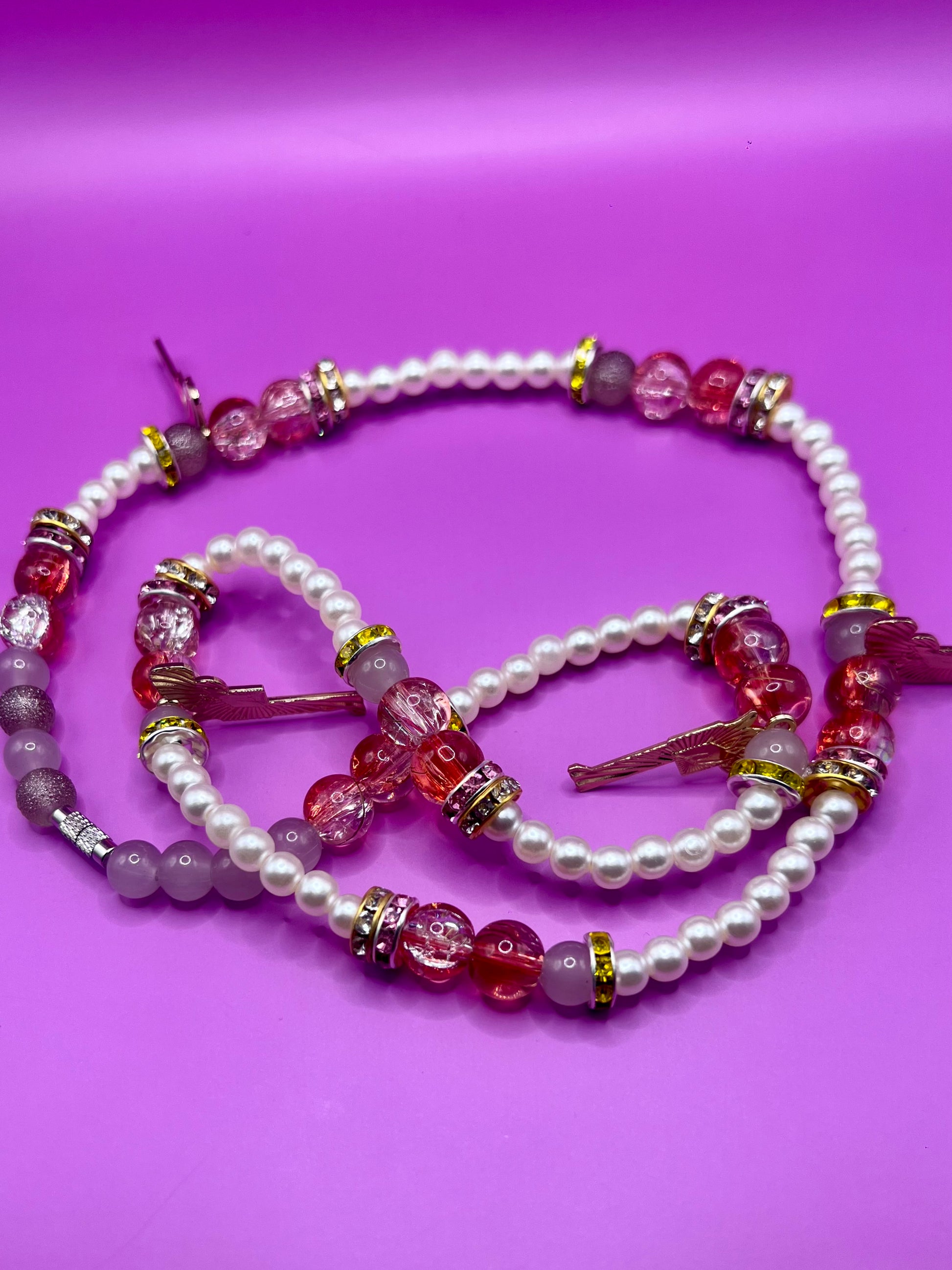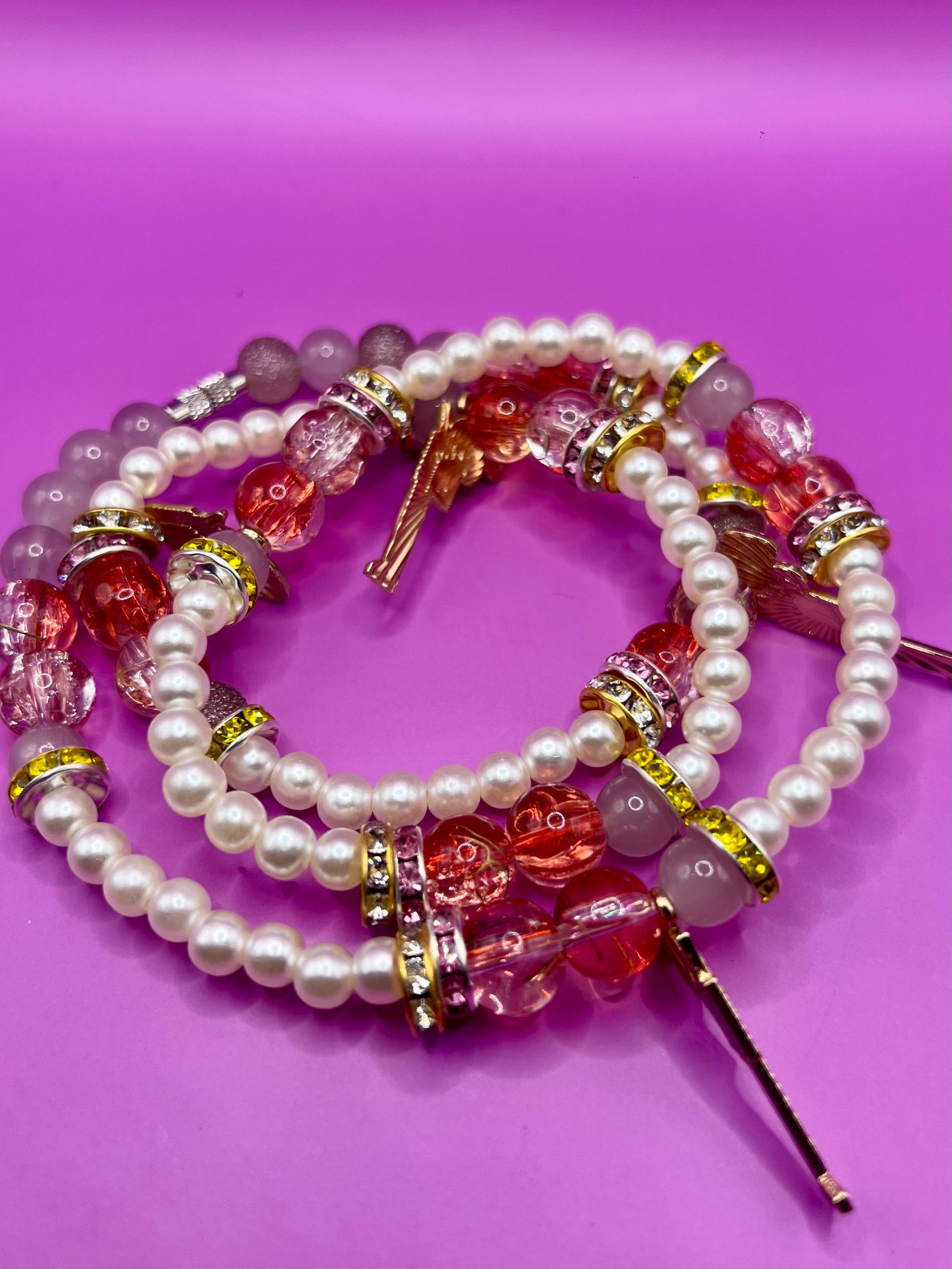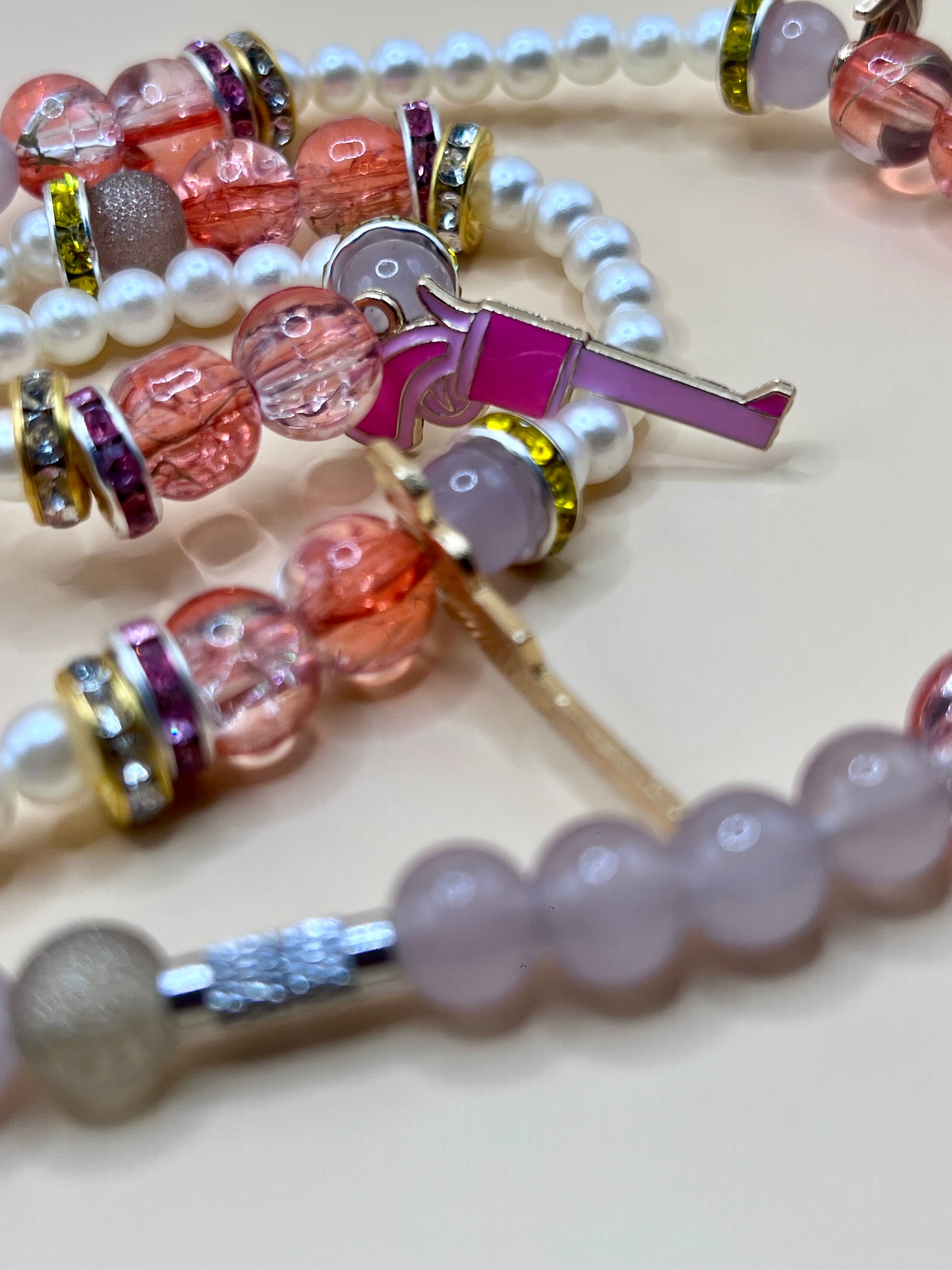 Colors used: Shades of Pink, Grey and Pearls. Yellow and Pink Rhinestone Spacers with Gold Charms