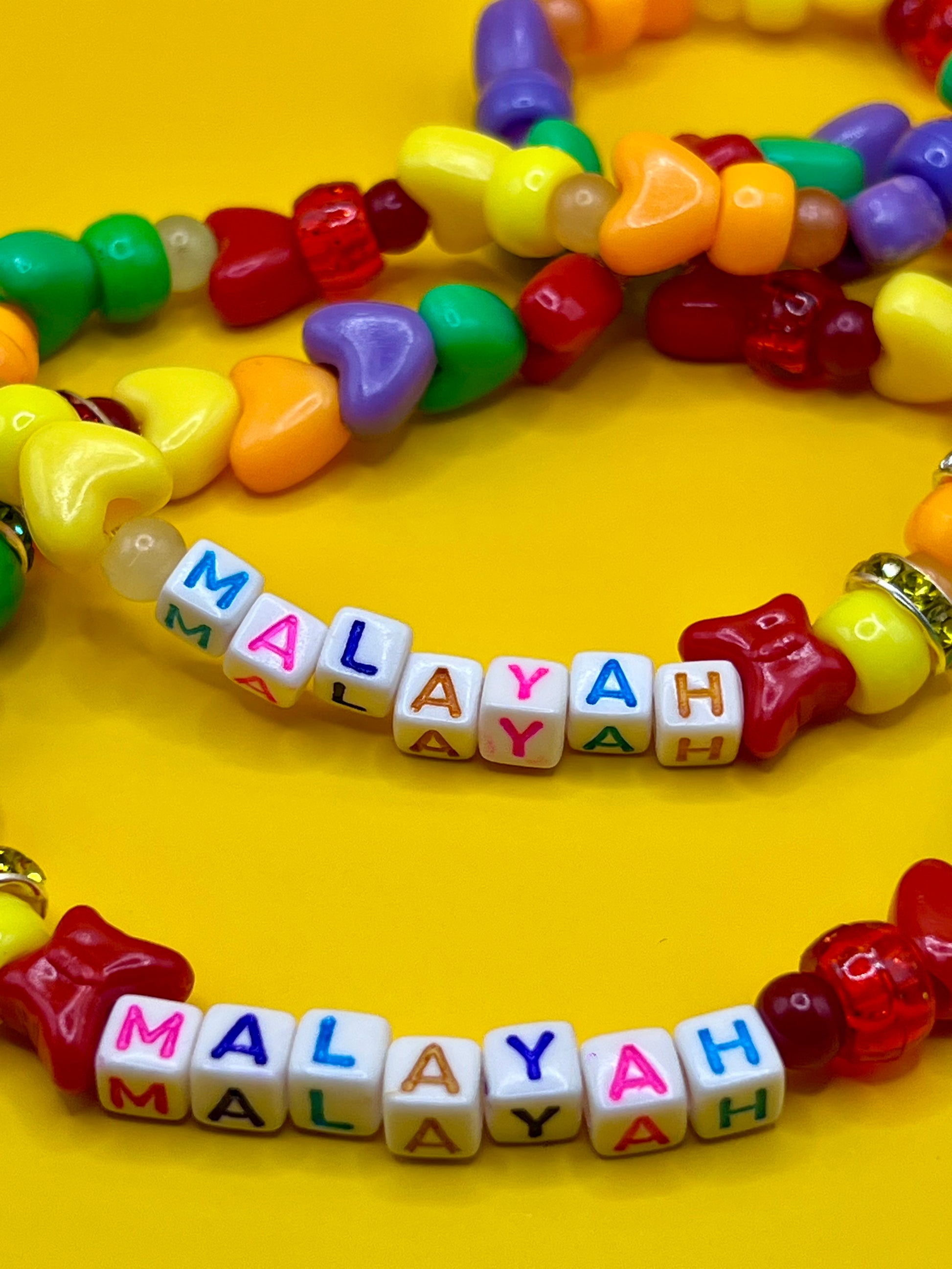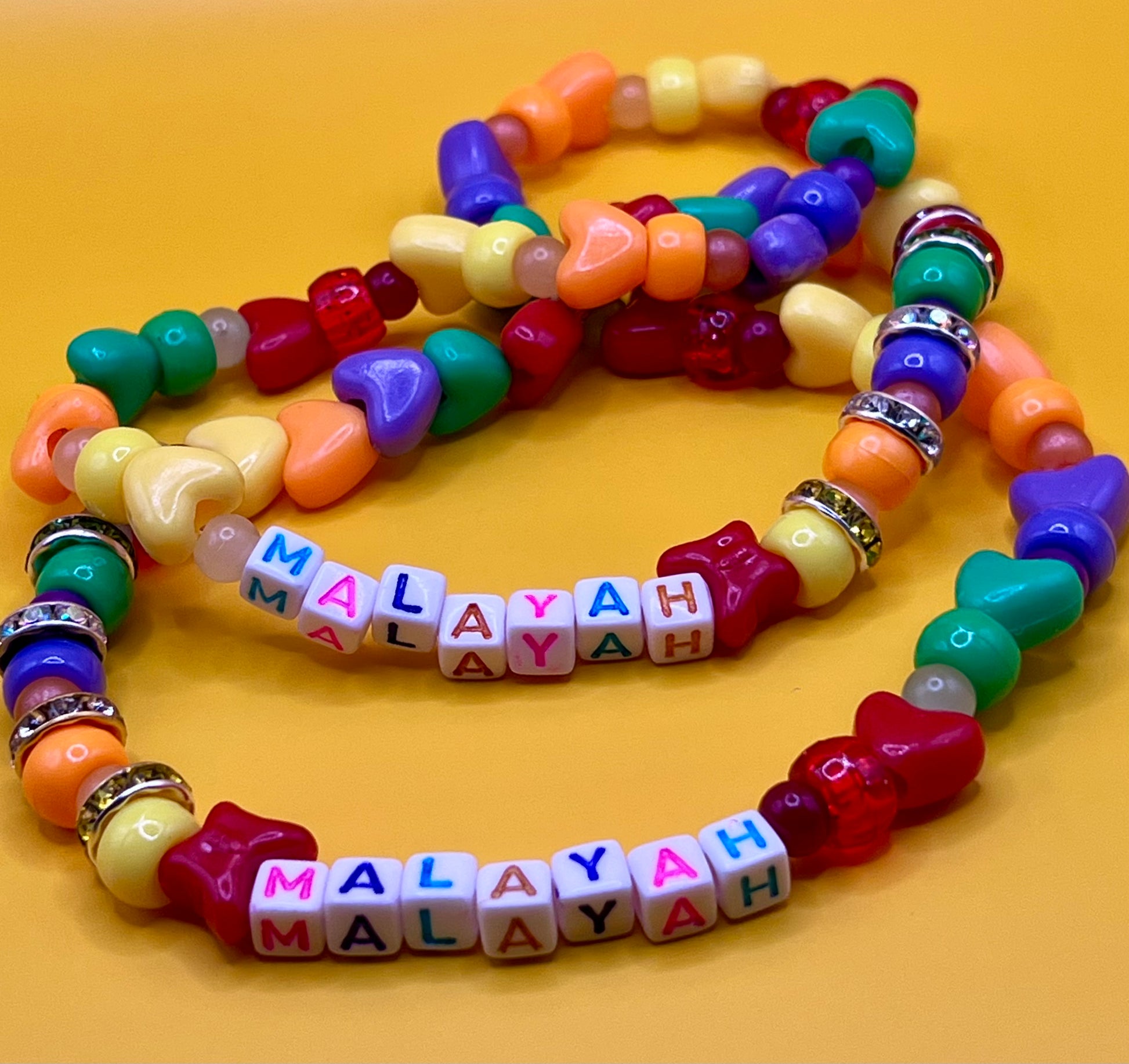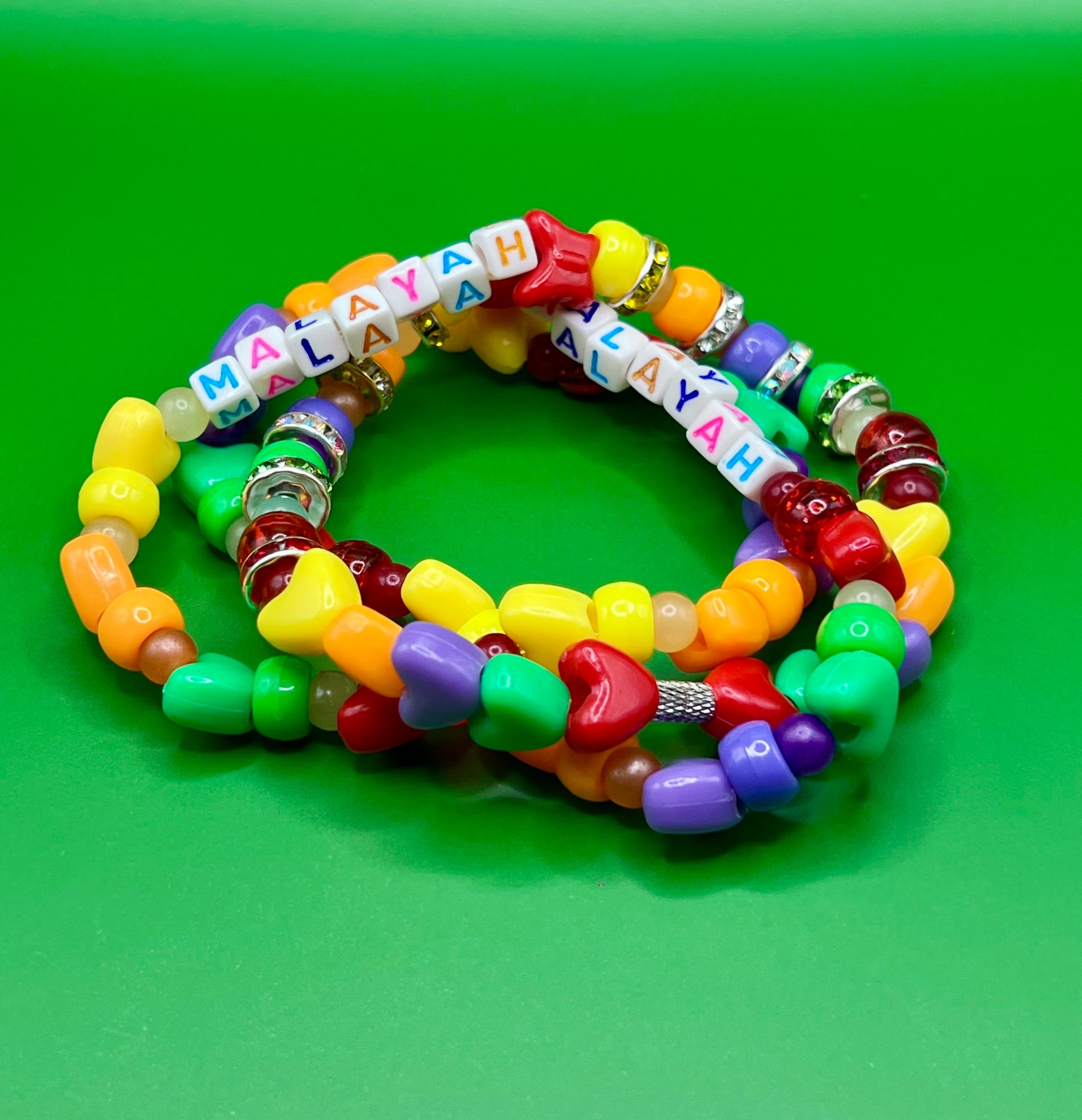 Colors used: Orange, Green, Yellow, Red, Purple. Paired with matching rhinestone spacers.