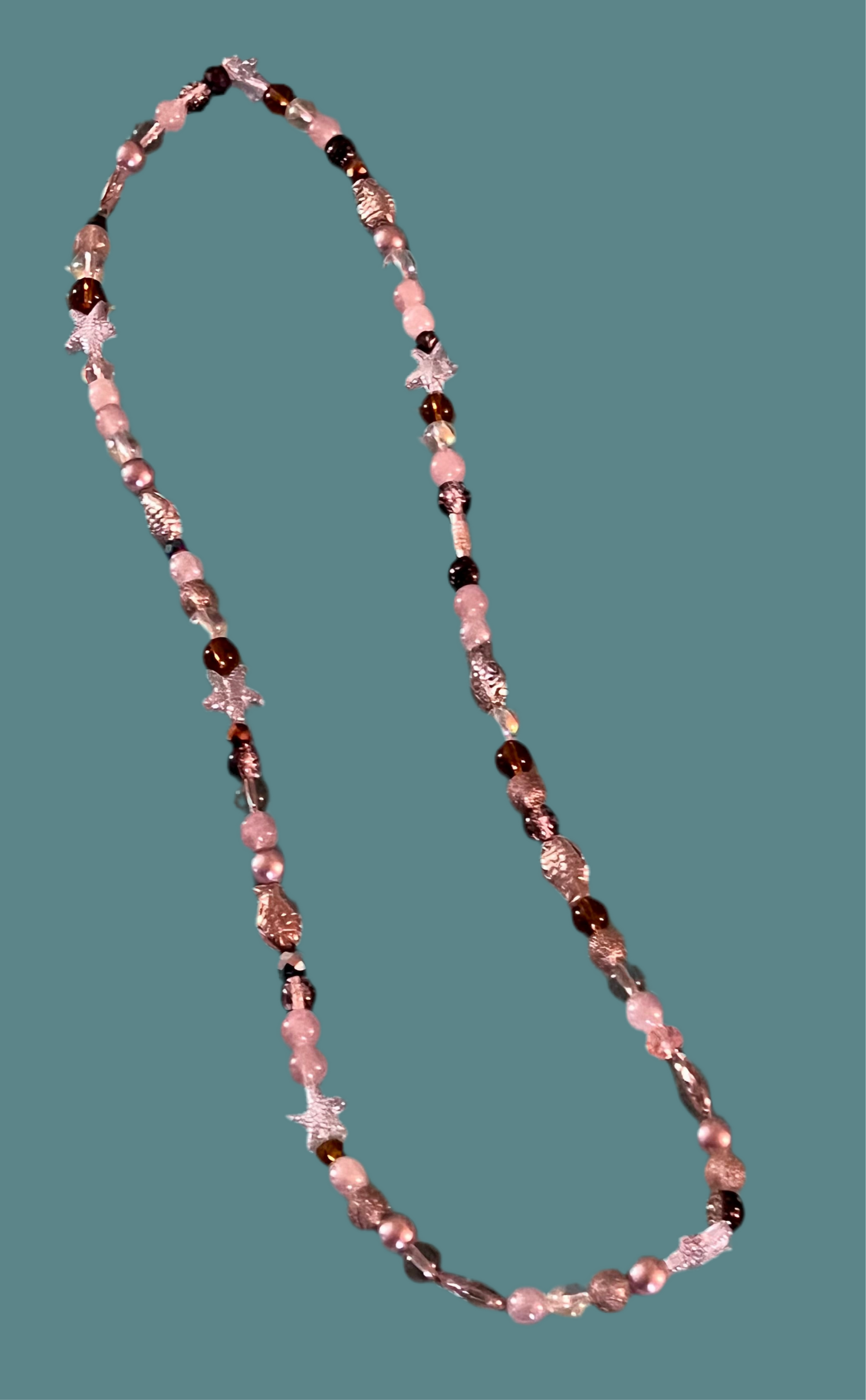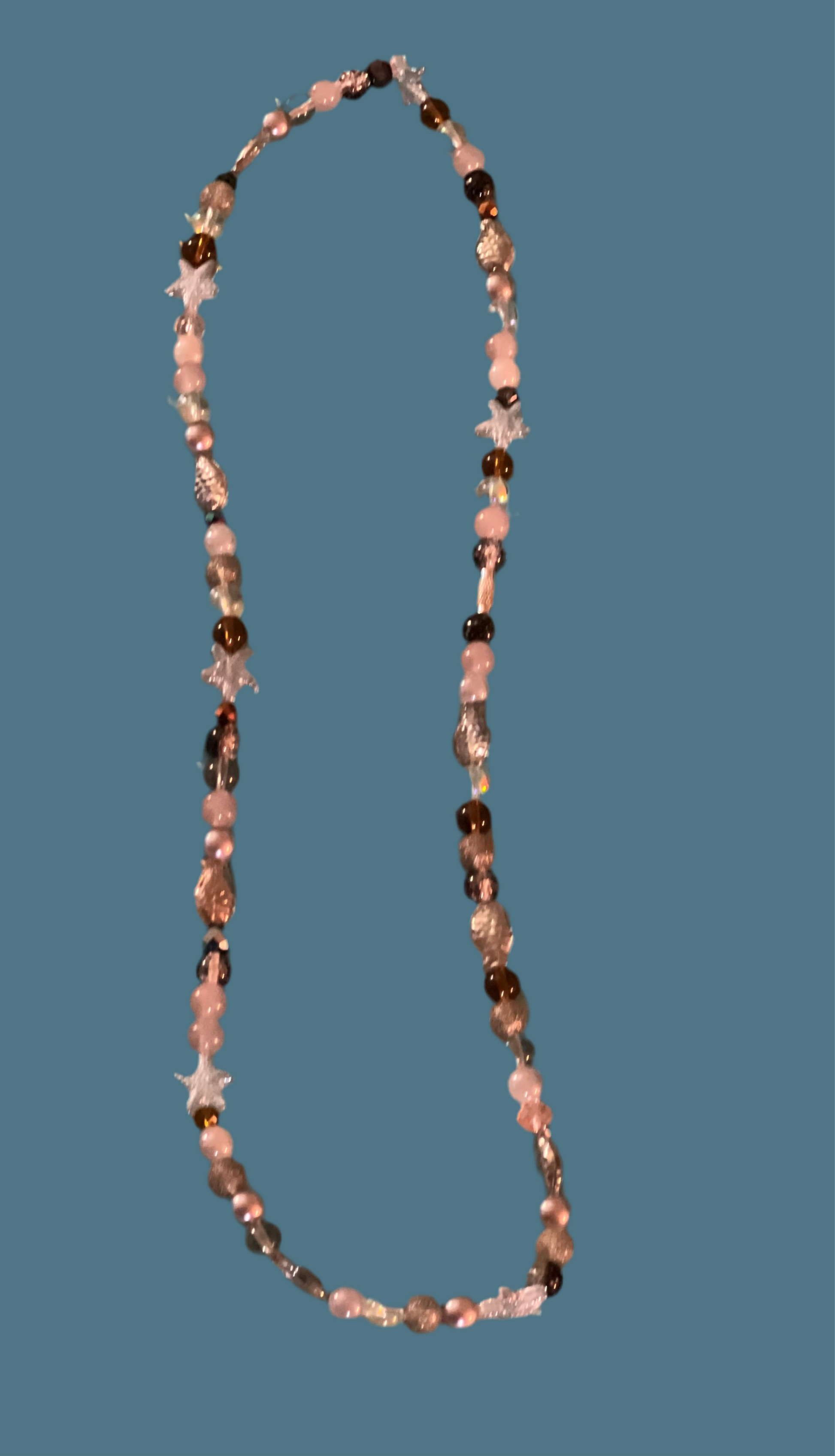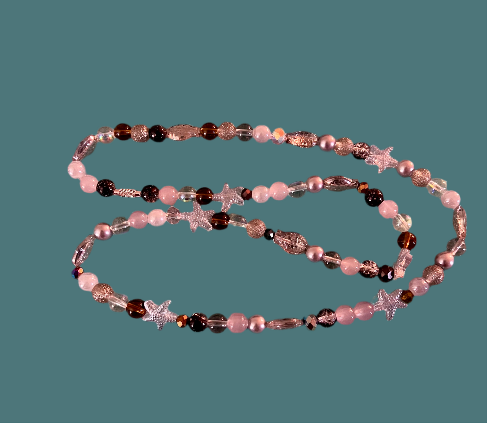 Colors used: Black, Brown, Clear. Paired with sea shell charms.