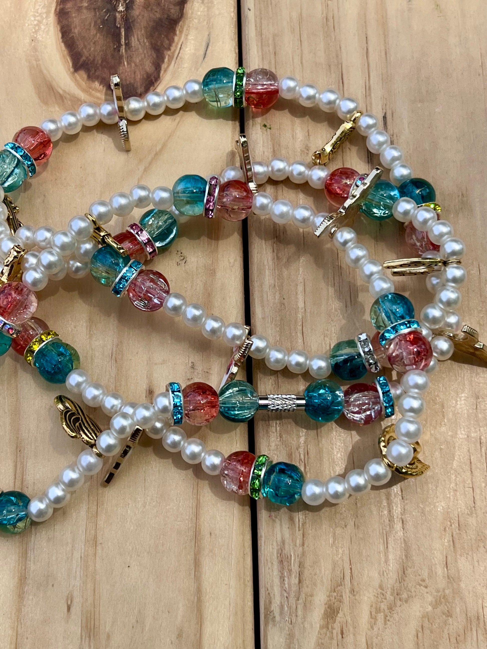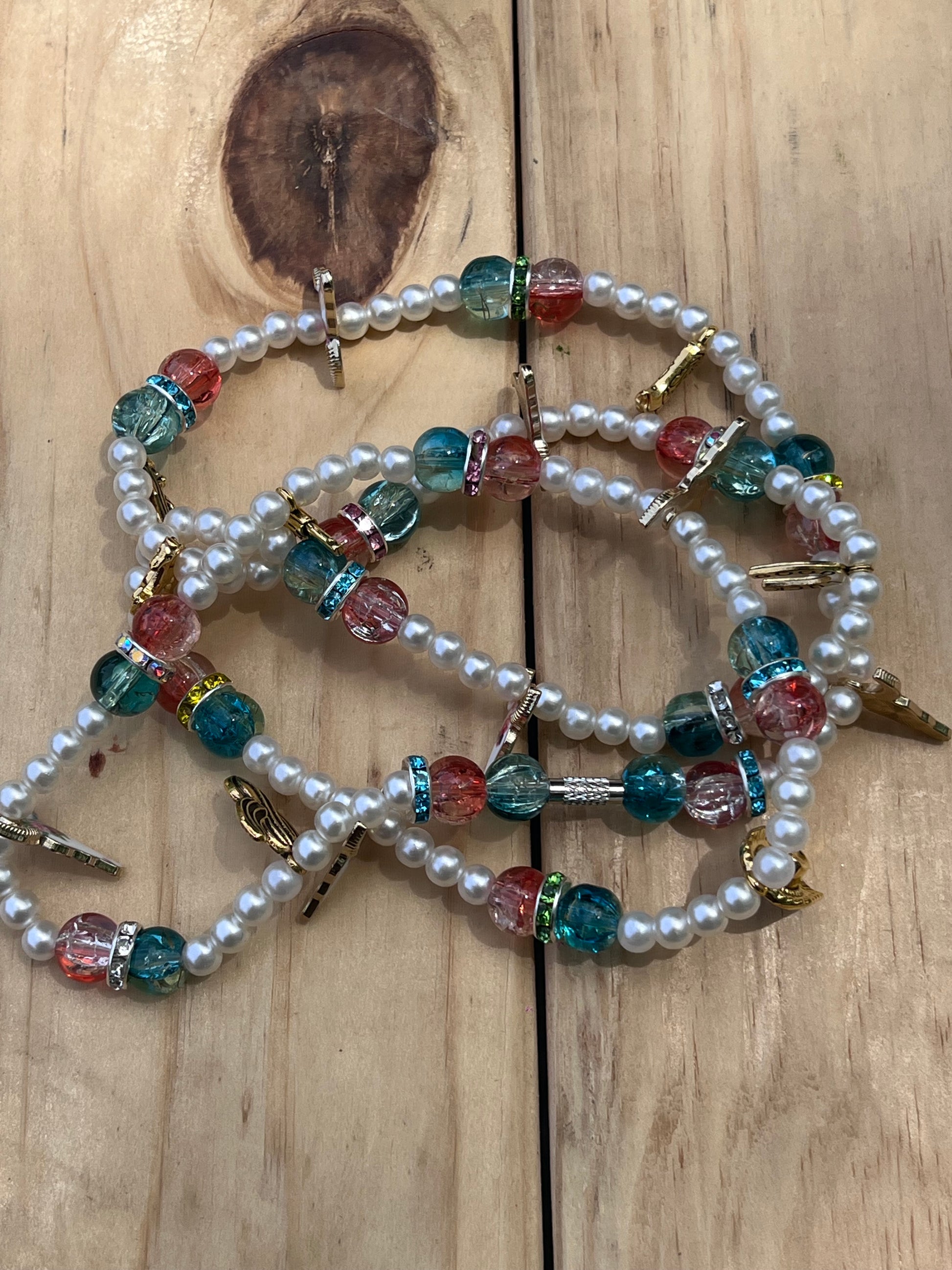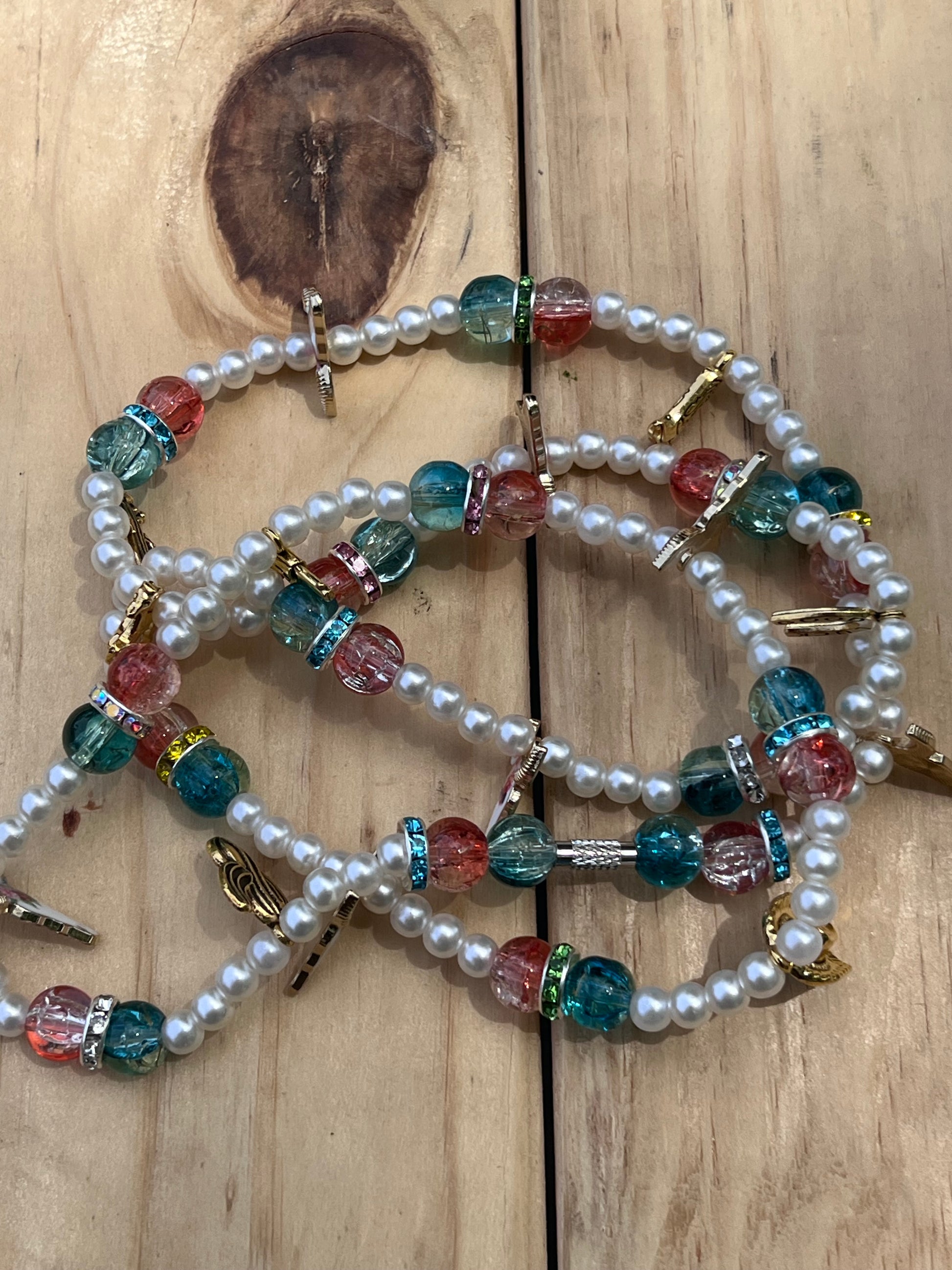 Colors used: Teal, Pink, Pearl. Paired with matching rhinestone spacers and Western theme hanging charms